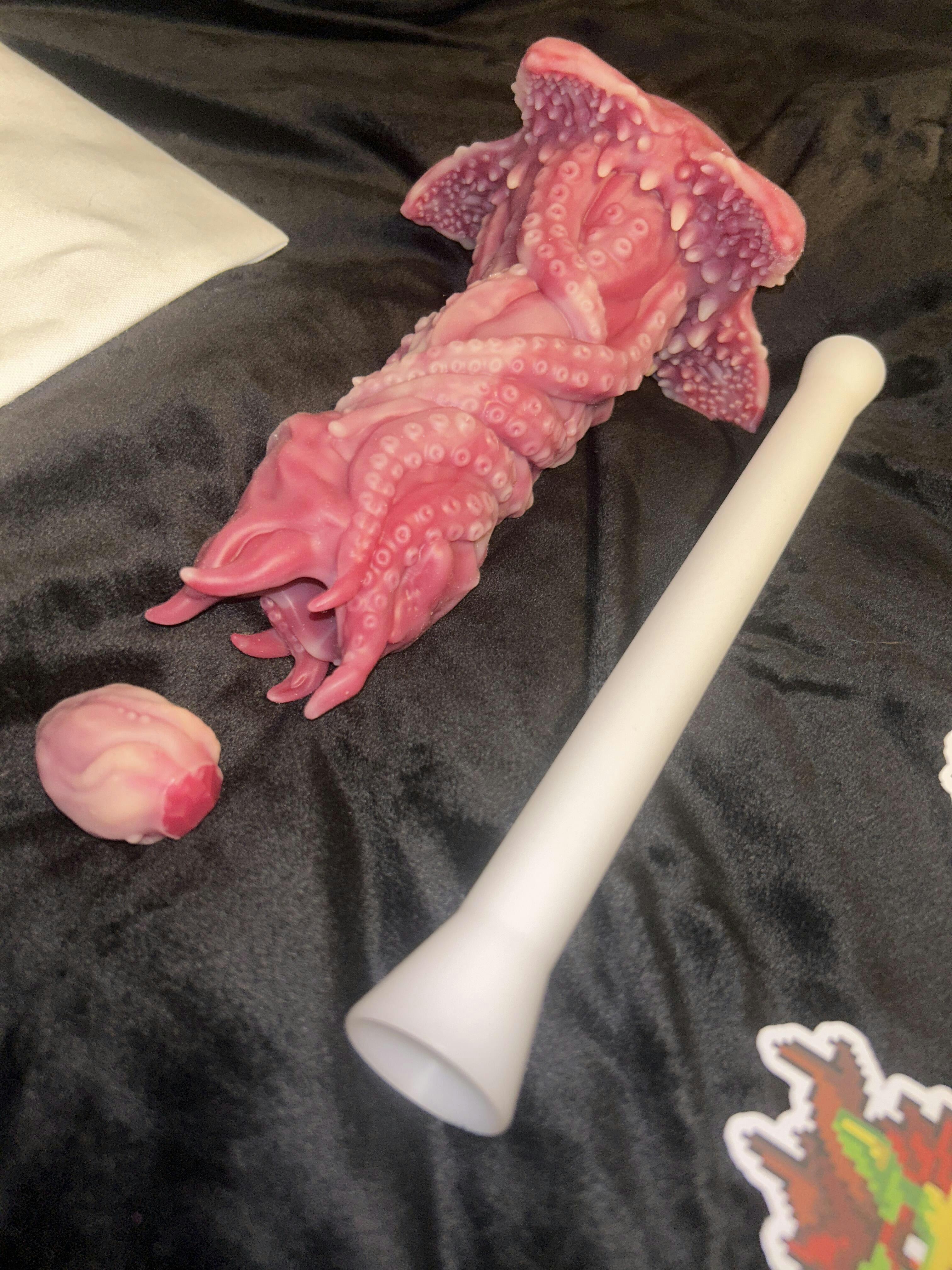 This is a fusion of styles of ovipositor dildo, the penis part we were influenced by H.R Giger's art style to create this combination of soft creatures and hard bones, grotesque and beautiful, with intricate textures and multi-tentacled suction cups for the ultimate layered sensation in your pussy.The Glans has a few small tentacles that can also tease your clitoris or perianal area. The base's petals are inspired by the world's largest flower species - Rafflesia. The soft little fangs on the petals provide comfortable friction. Does the exterior remind you of Stranger Things or Resident Evil?